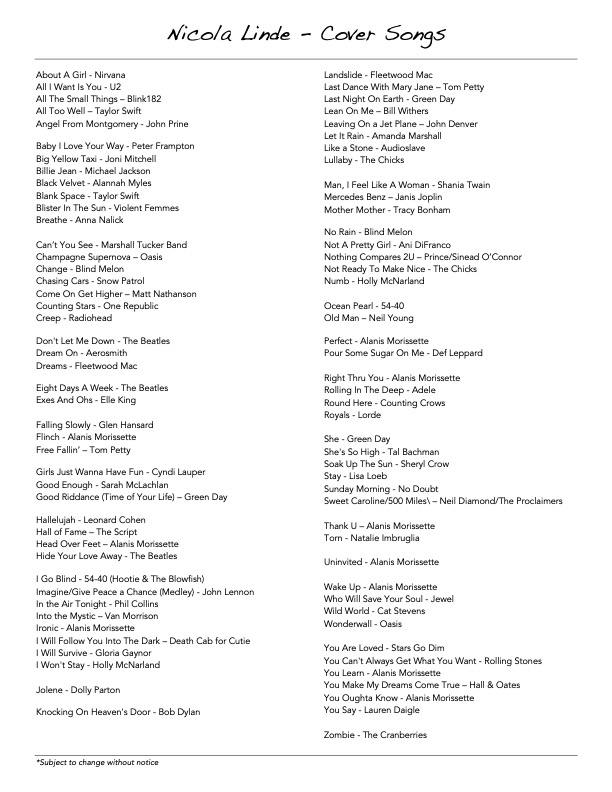 - a sample list of some songs that I cover, spanning the past few decades (to zoom in on a desktop, right click on the list and “open in new tab”):